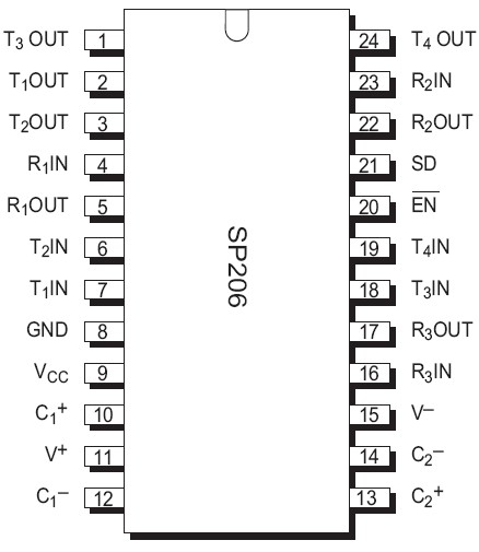 SP206是一款单芯片器件,支持3种物理层串行接口标准。SP206采用低功耗的BiCMOS工艺技术制造,包含4个驱动器和4个接收器,可通过软件随时对它们进行配置以用于所选的接口模式。SP206包括用于驱动器和接收器输出三态功能,该三态功能通过独立的使能线实现。SP206还包括通过模式选择管脚实现的关断模式,以便节省功耗。当和SP322 V.11可编程收发器配合使用时,SP206提供了CTS、RTS等握手/控制线所需的4路通道。这两个收发器IC是路由器、DSU/CSU和其它接入设备等网络设备中WAN串口的理想解决方案。