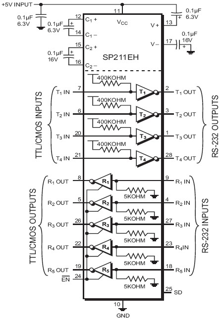 The SP206, SP207, SP208 and SP211 are multi-channel RS-232 line transceivers in a variety of configurations to fit most communication needs. All models in this series feature low-power CMOS construction and Exar Patented (5,306,954) on-board charge pump circuitry to generate the +/-10V RS-232 voltage levels, using 0.1μF charge pump capacitors to save board space and reduce circuit cost. The SP206 and SP211 models feature a low-power shutdown mode which reduces power sup- ply drain to 1 μA.