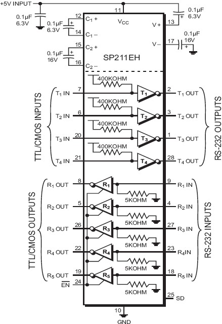 The SP208EH/211EH/213EH devices are high speed enhanced multi-channel RS-232 line transceivers with improved electrical performance. The SP208EH/211EH/213EH series is a superior drop-in replacement to our previous versions as well as popular industry standards. All devices feature very low power CMOS construction and the Exar-patented (5,306,954) on-board charge pump circuitry that generates the +/-10V RS-232 voltage levels using 0.1μF charge pump capacitors. The SP211EH and SP213EH devices feature a low-power shutdown mode, which reduces power supply drain to 1μA. Enhancements to this series include a higher transmission rate of 500kbps, a lower power supply current at 3mA typical (no load), and superior ESD performance. The ESD tolerance has been improved for this series to over +/-15kV for both Human Body Model and IEC61000-4-2 Air Discharge test methods.