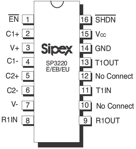 The SP3220E devices are RS-232 driver/receiver solutions intended for portable or hand-held applications such as palmtop computers, instrumentation and consumer products. These devices incorporate a high-efficiency charge-pump power supply that allows the SP3220E devices to deliver true RS-232 performance from a single power supply ranging from +3.0V to +5.0V. This charge pump requires only 0.1μF capacitors in 3.3V operation. The ESD tolerance of these devices is over ±15kV for both Human Model and IEC1000-4-2 Air discharge test methods. All devices have a low-power shutdown mode where the driver outputs and charge pumps are disabled. During shutdown, the supply current falls to less than 1μA