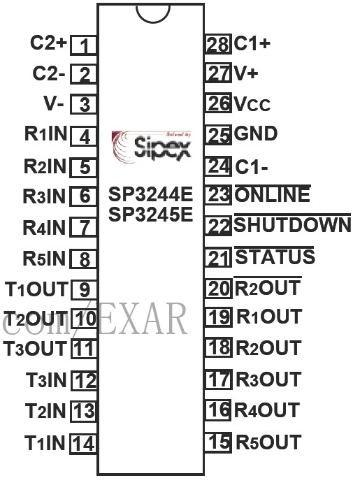 The SP3244E/3245E is a 3-driver/5-receiver device ideal for mobile phone, consumer and PDA applications. These devices use an internal high-efficiency, charge-pump power supply that requires only 0.1μF capacitors for 3.3V single-supply operation. This charge pump and Exar’s driver architecture allow the SP3244E/3245E to deliver compliant RS-232 performance from a power supply ranging from +3.0V to +5.5V. At voltages between +2.7V and +3.0V the driver outputs are compliant with RS-562 and can interface to RS-232 in portable applications. The Auto On-Line® Plus feature allows the device to automatically enter a low power shutdown mode if all receiver and driver inputs have been idle for 30 seconds. The device will “wake-up” from this automatic shutdown state upon detecting activity. This power saving feature functions without system intervention or modifications to software or drivers.