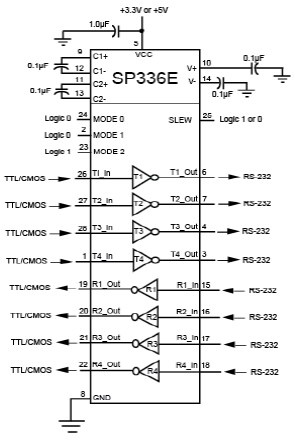 The SP336 is a programmable RS-232 and/or RS-485/RS-422 transceivers. The SP336 contains four drivers and four receivers when selected in RS-232 mode; and two drivers and two receivers when selected in RS-485 mode. In addition, it may be configured for RS-232 and RS-485/RS-422 mix mode configuration. The RS-232 transceivers can typically operate at 250kbps or 1Mbps while adhering to the RS-232 specifications. The RS-485/RS-422 transceivers can operate at 250kbps and 10Mbps while adhering to the RS-485/RS-422 specifications. The slew rate control pin minimizes problems with reflections on long and un-terminated cables. The RS-485/422 and RS-232 drivers and receivers can be disabled (High-Z output) by the three mode select pins.