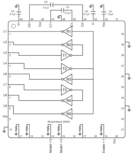 The SP339 is an advanced multiprotocol transceiver supporting RS-232, RS-485, and RS-422 serial standards in a 40 pin QFN package. Integrated cable termination and four configuration modes allow all three protocols to be used interchangeably over a single cable or connector with no additional switching components. Full operation requires only four external charge pump capacitors. The RS-485/422 modes feature one driver and one receiver (1TX/1RX) in both half and full duplex configurations. The RS-232 mode (3TX/5RX) provides full support of all eight signals commonly used with the DB9 RS-232 connector. A dedicated diagnostic loopback mode is also provided. The high speed drivers operate up to 20Mbps in RS-485/422 modes, and up to 1Mbps in RS-232 mode. All drivers can be slew limited to 250kbps in any mode to minimize electromagnetic interference (EMI). All transmitter outputs and receiver inputs feature robust electrostatic discharge (ESD) protection to ±15kV Human Body Model (HBM) and ±8kV IEC-61000-4-2 Contact. Each receiver output has full fail-safe protection to avoid system lockup, oscillation, or indeterminate states by defaulting to logic-high output level when the inputs are open, shorted, or terminated but undriven. No external biasing resistors are required.