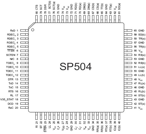 SP504是一个单芯片器件,支持广域网连接的8种物理串行接口标准。SP504采用低功耗BiCMOS工艺技术制造,包含一个Sipex专利(5,306,954)电荷泵,可在单(原文是”仅”)+5V的电源供电下工作。可随时通过软件针对上述任何接口模式对7个驱动器和7个接收器进行配置。SP504适合DTE-DCE应用。SP504的每个V.35驱动器仅需要一个外部电阻就能符合V.35的工作要求。