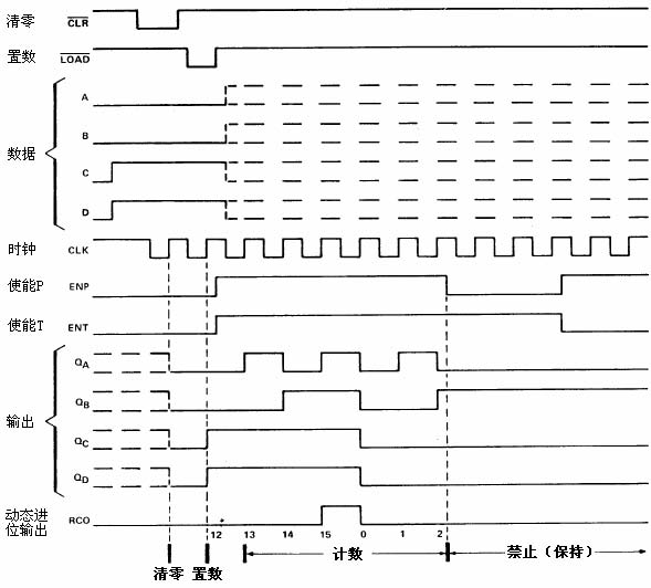 有了超前进位电路后,无须另加门,即可级联出 n位同步应用的计数器。它是借助于两个计数使能输入和一个动态进位输出来实现的。两个计数使能输入( ENP和 ENT)计数时必须是高电平,且输入 ENT必须正反馈,以便使能动态进位输出。因而被使能的动态进位输出将产生一个高电平输出脉冲,其宽度近似等于 QA输出高电平。此高电平溢出进位脉冲可用来使能其后的各个串联级。使能 ENP和 ENT输入的跳变不受时钟输入的影响。
