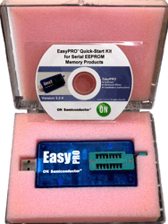 EasyPRO is an easy-to-use, software-driven device programmer that is controlled and powered from the standard USB port of a PC. Designed as an extremely portable module (no bigger than a cell phone), the programmer provides a user-friendly tool for designers, service professionals and dealers. EasyPRO allows you to write and read the content of the memory device (IIC, SPI and uWIRE) with either predefined patterns or your custom patterns. EasyPRO supports ON Semiconductor serial EEPROM devices, as well as competitor-equivalent products. The programmer is designed to support 8-pin devices in PDIP package. Other packages are supported using the appropriate test socket adapter.