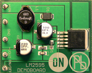 The LM2595 regulator is circuit ideally suited for easy and convenient design of a step-down switching regulator (buck converter). It is capable of driving a 1 A load with excellent line and load regulation. This device is available in adjustable output version and it is internally compensated to minimize the number of external components to simplify the power supply design. Demoboard size: 55mm x 35mm
