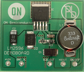 The LM2596 regulator is circuit ideally suited for easy and convenient design of a step-down switching regulator (buck converter). It is capable of driving a 3.0 A load with excellent line and load regulation. This device is available in adjustable output version and it is internally compensated to minimize the number of external components to simplify the power supply design. Demoboard size: 50mm x 43mm