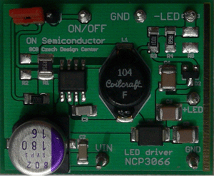 The NCP3066 is a monolithic switching regulator designed to deliver constant current for powering high brightness LEDs. The device has a very low feedback voltage of 235 mV (nominal) which is used to regulate the average current of the LED string. In addition, the NCP3066 has a wide input voltage up to 40 V to allow it to operate from 12 Vac or 12 Vdc supply, commonly used for lighting applications as well as unregulated supplies such as rechargeable batteries. The ON/OFF function allows turn the device to low consumption mode or regulate the brightness of LEDs. Size: 39mm x 32mm x 12mm