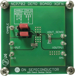 The NCP702 is a high performance 200mA Low Dropout Linear Regulator. This device delivers excellent noise and dynamic performance. Thanks to its adaptive ground current feature the device consumes only 10µA of quiescent current at no-load condition. The regulator features ultra-low noise of 11µVRMS, the PSRR of 68dB at 1kHz and very good load/line transient performance. Such excellent dynamic parameters and small package size make the device an ideal choice for powering the precision analog and noise sensitive circuitry in portable applications. The LDO achieves this ultra-low noise level without the need for a noise bypass capacitor. A Logic EN input provides ON/OFF control of the output voltage. When the EN is low the device consumes as low as typ. 10nA from the IN terminal. The device is fully protected in case of output overload, output short circuit condition and overheating assuring a very robust design. This demonstration board operates from a dc input voltage: VIN ≤ 5.5V and produces fixed output voltage which is set internally within the IC. External waveform generator could be connected to the EN (Enable) pin in order to verify the ON/OFF operation.