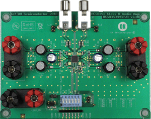 amplifier with LC output filters and a few external components mounted on an 2-layer FR4 board that can be used to directly drive speakers with an external audio source connected to the inputs.