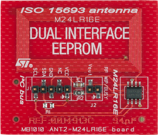 The ANT2-M24LR16E antenna reference board is a ready-to-use PCB that features an M24LR16E-R Dual Interface EEPROM IC connected to a 20 mm x 40 mm 13.56 MHz etched RF antenna on one side, and to an I²C bus on the other side.