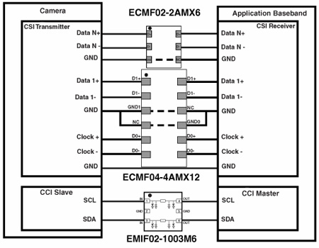 The ECMF02-2AMX6 is a highly integrated common mode filter designed to suppress EMI/RFI common mode noise on high speed differential serial buses like MIPI D-PHY, MDDI or USB 2.0.