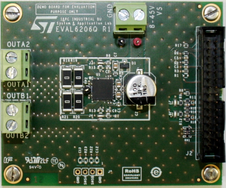 The EVAL6206Q demonstration board allows the user to test the L6206Q functions. The dual full bridges integrated into the L6206Q can be used to drive a single 2-phase stepper motor or up to four DC motors (unidirectional). The bridges can also operate in parallel mode. The board can be driven using the STEVAL-PCC009V2 communication board and the PractiSPIN 2 evaluation software.