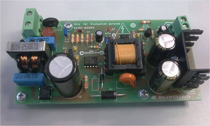 The board uses the new VIPER37LE, an offline high voltage converter from the VIPerPlus family, specifically designed for fixed frequency flyback converters, which combines a high-performance low voltage PWM controller chip and a max. 4.5 Ω RDS(on), 800 V BV(DSS), avalanche-rugged power MOSFET in the same package.