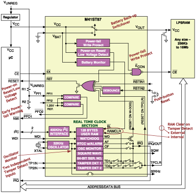 M41ST87防篡改IC 为ST公司推出的首个用于安防应用领域的监控器,该芯片具有两路独立的防篡改侦测电路,用来对需要对敏感数据进行保护的系统的入侵进行侦测以及作出反应。RAM清除功能可以配置为清除M41ST87的内部RAM、非易失性RAM以及/或外部RAM,同时还产生一个处理器中断。振荡器故障电路监测对振荡器的改动,同时,每个设备内的唯一的序列号能够为安防应用提供可溯源性。
