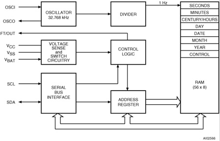 The M41T56 is a low-power, serial real-time clock (RTC) with 56 bytes of NVRAM. A built-in 32,768 Hz oscillator (external crystal controlled) and the first 8 bytes of the RAM are used for the clock/calendar function and are configured in binary coded decimal (BCD) format. Addresses and data are transferred serially via a two-line, bidirectional bus. The built-in address register is incremented automatically after each WRITE or READ data byte.
