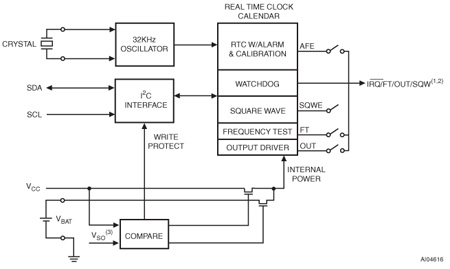 Functions available to the user include a non-volatile, time-of-day clock/calendar, alarm interrupts, watchdog timer and programmable square wave output. The eight clock address locations contain the century, year, month, date, day, hour, minute, second and tenths/hundredths of a second in 24-hour BCD format. Corrections for 28, 29 (leap year - valid until year 2100), 30 and 31 day months are made automatically.