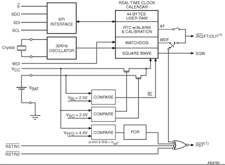 An additional 12 bytes of RAM provide status/control of Alarm, Watchdog and Square Wave functions. Addresses and data are transferred serially via a serial SPI interface. The built-in address register is incremented automatically after each WRITE or READ data byte. The M41T94 has a built-in power sense circuit which detects power failures and automatically switches to the battery supply when a power failure occurs. The energy needed to sustain the SRAM and clock operations can be supplied by a small lithium button-cell supply when a power failure occurs. Functions available to the user include a non-volatile, time-of-day clock/calendar, Alarm interrupts, Watchdog timer and programmable Square Wave output. Other features include a Power-On reset as well as two additional debounced inputs ( RSTIN1 and RSTIN2 ) which can also generate an output reset ( RST ). The eight clock address locations contain the century, year, month, date, day, hour, minute, second and tenths/hundredths of a second in 24 hour BCD format. Corrections for 28, 29 (leap year - valid until year 2100), 30 and 31 day months are made automatically. The ninth clock address location controls user access to the clock information and also stores the clock software calibration setting.