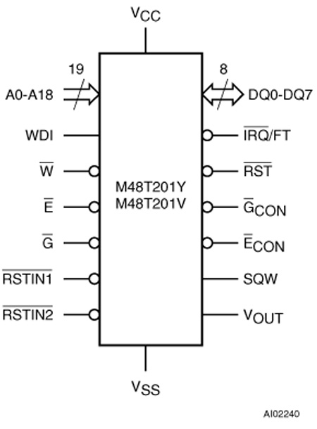 The M48T201Y/V are self-contained devices that include a real time clock (RTC), programmable alarms, a watchdog timer, and a square wave output which provides control of up to 512 K x 8 of external low-power static RAM. Access to all RTC functions and the external RAM is the same as conventional bytewide SRAM. The 16 TIMEKEEPER® registers offer year, month, date, day, hour, minute, second, calibration, alarm, century, watchdog, and square wave output data. Externally attached static RAMs are controlled by the M48T201Y/V via the GCON and ECON signals.