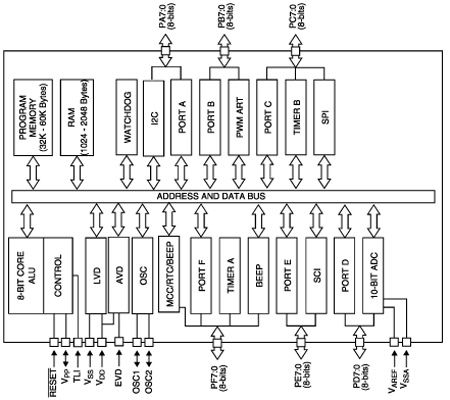 - 8-bit PWM Auto-reload timer with: 2 input captures, 4 PWM outputs, output compare and time base interrupt, external clock with event detector