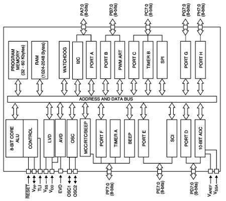 - 8-bit PWM Auto-Reload timer with: 2 input captures, 4 PWM outputs, output compare and time base interrupt, external clock with event detector
