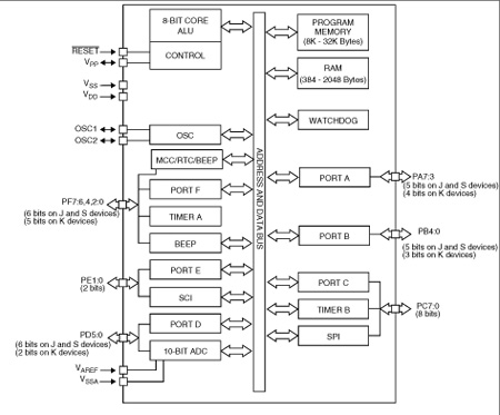 The on-chip peripherals include an A/D converter, 2 general purpose timers, an SPI interface and an SCI interface.