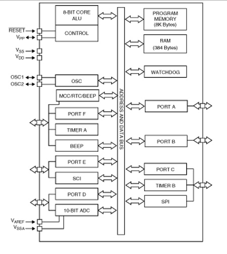 - Clock sources: crystal/ceramic resonator oscillators and bypass for external clock