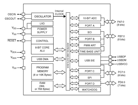 | ST72623F2 : DS1882: Low speed USB 8-BIT MCU with 3 endpoints, Flash or ROM memory, LVD, WDG, 10-bit ADC, 2 timers, SCI, SPI |