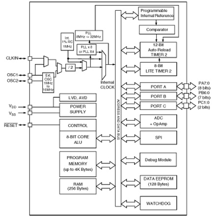 - Clock sources: Internal 1% RC oscillator (on ST7FLITE15B and ST7FLITE19B), crystal/ceramic resonator or external clock