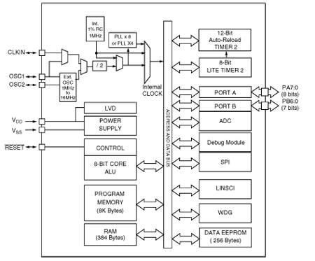 - Clock sources: Internal 1% RC oscillator, crystal/ceramic resonator or external clock