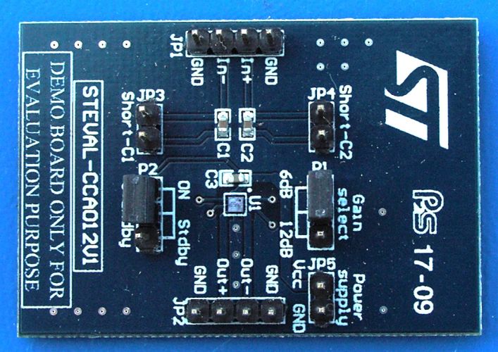 The STEVAL-CCA012V demonstration board is constructed on a two-layer PCB with easily accessible connectors, allowing users to change or drive the gain select and standby control pin, and to change the input configuration.
