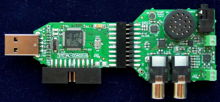 The STEVAL-CCA021V1 demonstration board implements a USB audio card based on the STM32F103RE microcontroller and the TS4657 audio digital-to-analog converter (decoder). The complete system consists of a controller board driven by the STM32F103RE microcontroller, and a TS4657-based audio board.