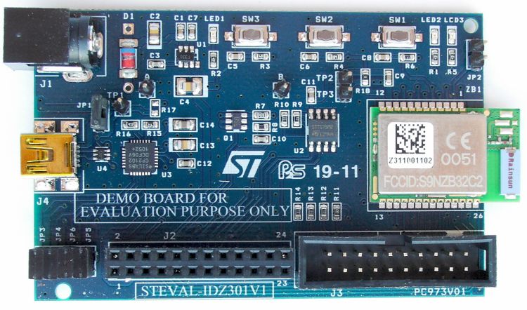 The STEVAL-IDZ30xV1 is a demonstration board of the SPZB32W1 series of IEEE 802.15.4 ZigBee®RF modules based on the STM32W108CU6 microcontroller that integrates a 32-bit ARM®Cortex™ - M3 microprocessor and a 2.4 GHz, IEEE 802.15.4 radio.