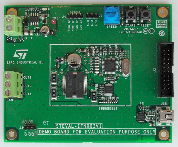 The STEVAL-IFN003V1 demonstration board is based on STMicroelectronics’ ARM™ Cortex-M3 core-based STM32F103 microcontroller and the DMOS fully integrated three-phase motor driver L6230 implementing field-oriented control of a PMSM motor.
