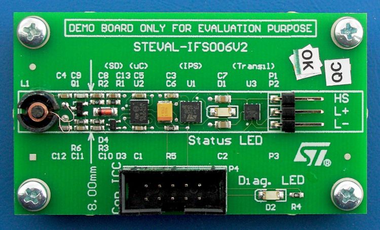 The STEVAL-IFS006V2 demonstration board is an inductive proximity switch application based on the principle of metal body detection using the eddy current effect on the HF losses of a coil.