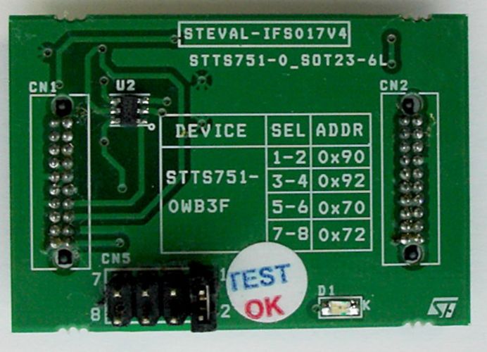 The STEVAL-IFS017V4 demonstration board is a temperature sensor daughter card based on the STTS751-0WB3F in SOT package.
