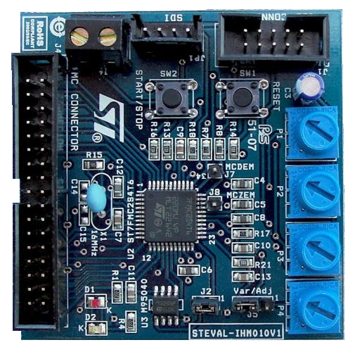 The STEVAL-IHM010V1 demonstration board is a complete development platform for STMicroelectronics' 8-bit ST7MCx microcontroller with 16 KB internal Flash memory. Based on a cost-effective, flexible and open design, the board helps demonstrate the ST7MCx's capabilities and enables rapid evaluation of the microcontroller's motor-control peripherals.