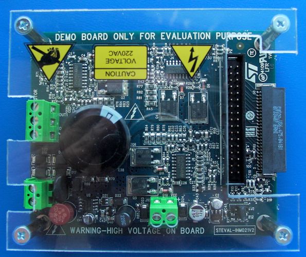 The STEVAL-IHM021V2 demonstration board implements a 100 W, 3-phase inverter for field-oriented control (FOC) of permanent magnet synchronous motors (PMSM).