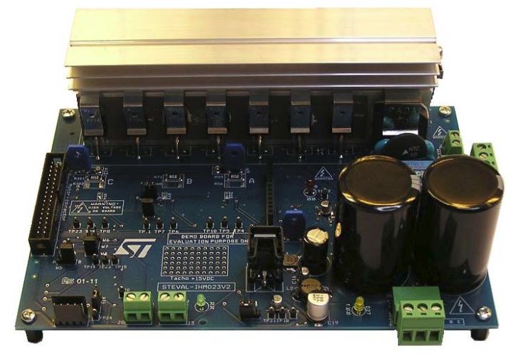 The STEVAL-IHM023V2 is a universal, fully evaluated and populated design consisting of a three-phase inverter bridge based on STMicroelectronics’ 600 V IGBT STGP10NC60KD in a TO-220 package mounted on a heatsink and the L6390 high-voltage high-side and low-side driver featuring an integrated comparator for hardware protection features such as overcurrent and overtemperature. The driver also integrates an operational amplifier suitable for advanced current sensing. Thanks to this advanced characteristic, the system has been specifically designed to achieve an accurate and fast conditioning of the current feedback, thus matching the typical requirements in field oriented control (FOC).The board has been designed to be compatible with single-phase mains, supplying from 90 VAC to 285 VAC or from 125 VDC to 400 VDC for DC voltage. With reconfiguration of the input sourcing, the board is suitable also for low-voltage DC applications up to 35 VDC.
