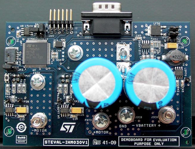 The STEVAL-IHM030V1 is a brushed DC motor (BDC) demonstration kit which presents a 24 V, up to 2 kW brushed DC motor drive solution.