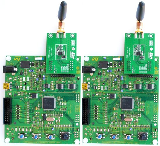 The STEVAL-IKR001V6 development kit includes 2 RF daughterboards based on the SPIRIT1 low power, sub-GHz low data rate transceiver suitable for ISM bands and wireless M-BUS, and 2 motherboards based on the STM32L low power microcontroller to control the daughterboards.