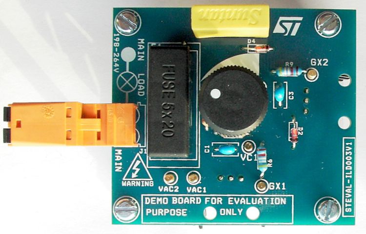 The purpose of the STEVAL-ILD003V1 demonstration board is to evaluate ST’s SCR dimming solution for low-consumption lamps, particularly CFL and LED lamps, eliminating flicker, and to be able to directly test most dimmable loads currently on the market.