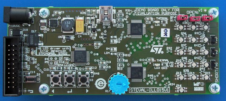 The STEVAL-ILL015V1 demonstration board provides a platform for the testing and evaluation of STMicroelectronics’ Power Logic LED driver STP24DP05.