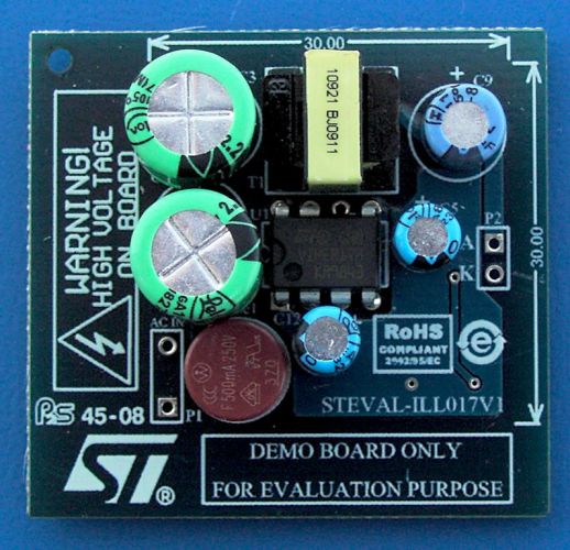 The STEVAL-ILL017V1 demonstration board is a 2 W non-isolated offline constant current LED driver based on the VIPer17. The board operates with an input ranging from 176 V to 264 VAC and provides 500 mA of constant current from a 7 VDC source, suitable for illuminating two LEDs in series.