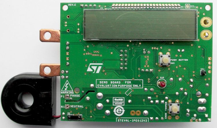 The STEVAL-IPE012V2 demonstration board is a fully functional single-phase solution with parameter display, tamper management, maximum demand (MD) calculation, EEPROM data logging, and low-power management.