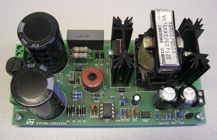 The STEVAL-ISA019V3 demonstration board is a 3-phase auxiliary power supply with an 80 W dual output SMPS, using the L6565 PWM driver and the STC04IE170HP ESBT as the main switch. The combination of these ST parts provides a high-efficiency solution for high DC input voltage, a typical requirement of any 3-phase application.