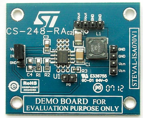 The STEVAL-ISA070V1 demonstration board is based on the ST1S31, an internally compensated 1.5 MHz fixed-frequency PWM synchronous step-down regulator. This device operates from 2.8 V to 5.5 V input, while it regulates an output voltage as low as 0.8 V and up to Vin.