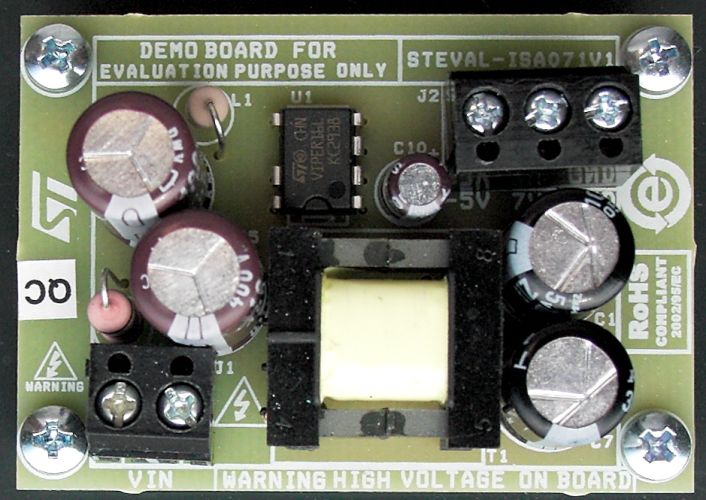 The STEVAL-ISA071V1 switched-mode power supply (SMPS) demonstration board is dedicated to mains applications requiring -5 V and +7 V referred to neutral. The non-isolated SMPS is capable of delivering 4 W of output power over a wide input voltage range. This capability can also be applied to higher power outputs or different voltage ranges.