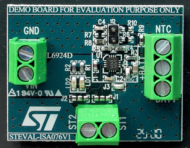 | STEVAL-ISA076V1 : DB1154: Battery charger demonstration board with integrated power switch for Li-Ion/Li-Polymer batteries based on the L6924D |